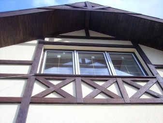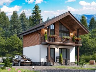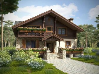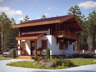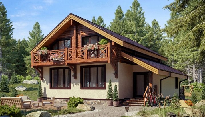 Ако сградата има тавански етаж под покрива, тогава просторен балкон трябва да го съседи. Дъното на къщата обикновено е завършено с камък, а горната част с дърво. Това прави сградата още по -топла. За добър изглед отворите на прозорците са направени доста големи..