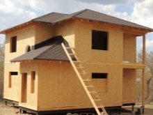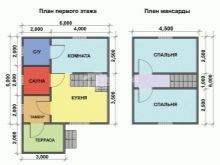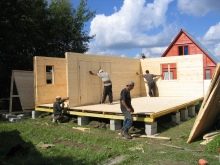 Можете да използвате канадска технология, която използва дървени греди.. Това е функционална и проста сграда, която не изисква много инвестиции. Къща от рамкови панели може да бъде издигната върху колонна основа, ако искате да спестите пари, тъй като тухлената е по-скъпа. Таванското помещение може да изпълни задачата на втория етаж, въпреки че за монтажа на покрива са необходими повече строителни материали, но това няма да повлияе на разходите. Ако изберете двускатен покрив, под него лесно се поставят две легла.