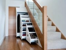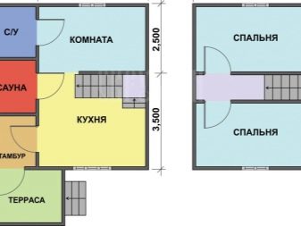 Первазите на прозорците в такива къщи често се превръщат в малки магазини. Стълбището в оформлението на сгради 6х7 м обикновено е многофункционално – всяка стъпка се използва като допълнителен модул за съхранение.