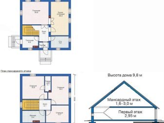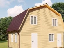 Такива къщи са изградени от различни материали.. Най -печелившата е дървена къща с таван – нейното изграждане ще струва по -малко от подобна конструкция с покрив от газобетон. В същото време двуетажна къща с таванско помещение винаги ще струва повече от едноетажна, но стаите в нея ще бъдат по-просторни. Освен това тук можете да разпределите място за помощен блок, без да се засяга жилищното пространство..