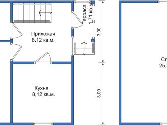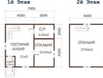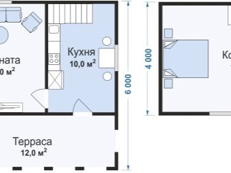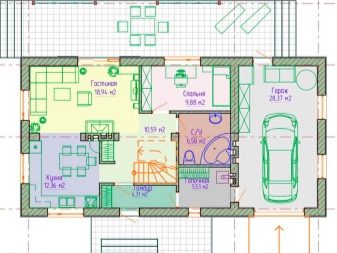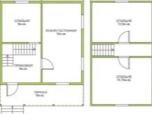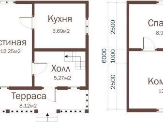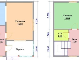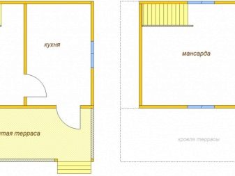 Отличен вариант за къщи 6 на 7 м е двуетажна таванска къща с веранда. В този случай е възможно да се осигурят всички функционални стаи, които са само необходими. В същото време кухнята, холът и холът ще бъдат удобни и просторни. Освен това тук са поставени компактни спомагателни блокове. Самата веранда е направена квадратна, правоъгълна или има друга оригинална форма..