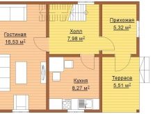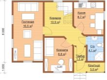 Обикновено, входът към къщата е през малък вестибюл, той се намира до гаража. От дясната страна на коридора са разположени баня и котелно помещение, хол с кухненски блок – отляво. Спалнята се намира срещу входа.