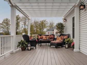 Терасата е отворено пространство, което свързва улицата и къщата, поради което местоположението на главния вход се избира най -често. Но има зони за отдих, отделени от къщата, тогава е важно да се организира удобен и естетичен преход. Частна къща с таван, от която се отваря излаз към терасата, е друг популярен вариант на проект, възможен само в двуетажна къща.