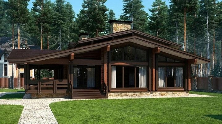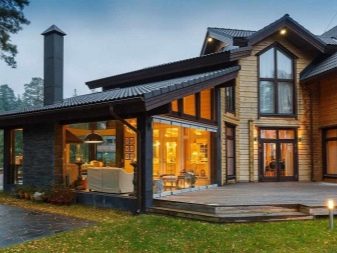 - Къща в стил хижа с големи панорамни прозорци и странична тераса е грандиозна структура, която ще украси всяка крайградска зона.