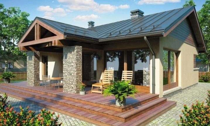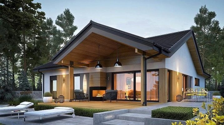 Едноетажна сграда е по-икономична, можете да изберете по-евтина основа. Това се отразява на общия бюджет за строителство и времето на строителството на къщата. Ще бъде по -топло поради терасата, следователно топлоизолацията ще изисква по -малко инвестиции. Предимството на едноетажни къщи с тераса е, че те изглеждат хармонично на всяко място, не изискват изграждане на стълби, а терасата увеличава площта на къщата през топлия сезон. Зоната за отдих на приземния етаж може да бъде отворена или затворена. Вторият е по -практичен по отношение на защитата от атмосферни влияния. Търсят се много проекти.