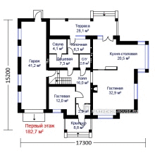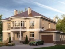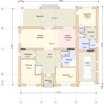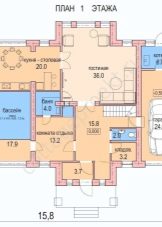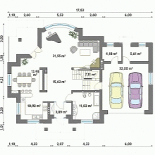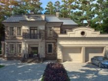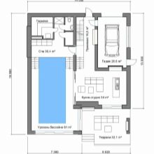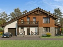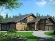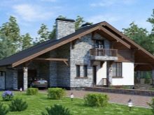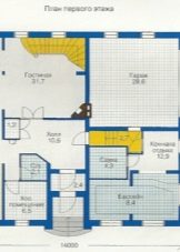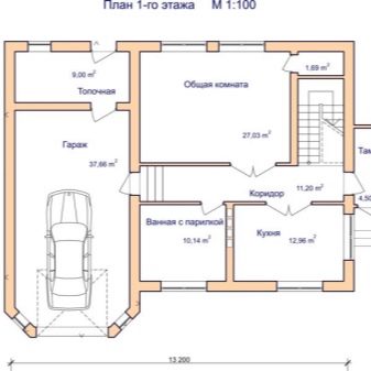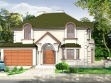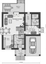 Струва си да се обърне внимание на този проект. Всичко тук е обмислено за удобство на жителите. Основното е да проектирате първия етаж в детайли, тъй като тук има много стаи. Гаражът е вграден в къщата и от него можете да отидете директно до банята. Можете също да влезете в него от залата. Има изход към терасата от сауната, а можете да стигнете до нея и от кухнята. Къщата разполага с просторна кухня-хол, която ви позволява да поставите всичко необходимо и да създадете много уютен кът за сядане. Освен това на партерния етаж са разположени котелно помещение, баня и една спалня. На втория етаж или на тавана в такава къща спалните обикновено са разположени за всички членове на семейството..