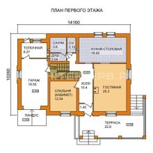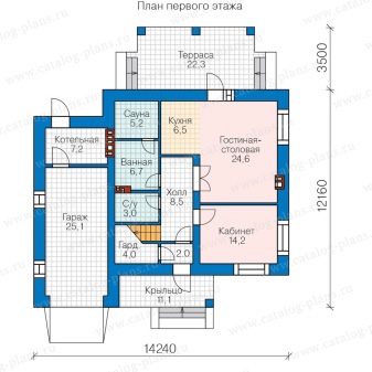 - Друг вариант също не е лош. Освен помещението за гаража, отвън има и сенник, който ви позволява да поставите две коли, или да използвате сенник при топло време, а при студено – гараж. Успяхме да уредим сауна до котелното, наблизо има и баня. Голяма кухня-хол има достъп до терасата. На първия етаж имаше място за килер, гардероб и дори офис. Разбира се с такова оформление, че всички помещения за спане и почивка ще бъдат разположени на втория етаж..