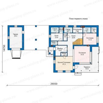 Ако площта на обекта позволява, тогава повече място се дава на самата къща, което означава, че първият етаж може да бъде по -обширен. И дори ако къщата има сауна и басейн, може все още да има достатъчно място на приземния етаж за кухня-хол и една стая за гости..
