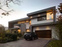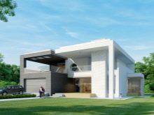 - Висока технология. В някои отношения можете да намерите прилики с минимализма. Това също е ясна геометрия, без допълнителни детайли, задължително плосък покрив. Но предпочитание се дава на сиви и сребърни цветове, наличието на метал е характерна черта на стила, както и голямо количество стъкло. Обикновено това са големи панорамни прозорци..