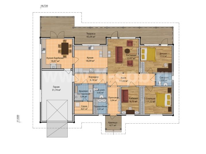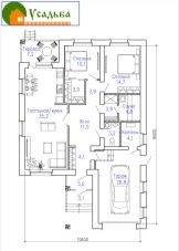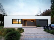- Но ако къщата е едноетажна, всички необходими помещения могат да бъдат разположени в това пространство, както в този случай. В един блок има сауна с душ и баня. До голяма тераса може да се влиза от няколко стаи едновременно. В допълнение към кухнята има и зона за барбекю. Достатъчно място за всекидневна. Тук се намират и други важни стаи: спалня, офис, детска стая. Гаражът има един покрив с къщата.