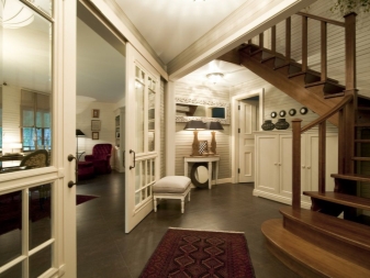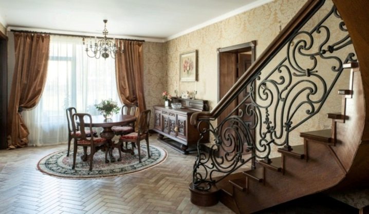В тази къща се използват същите класически техники, но трябва да се отбележи, че стаята изглежда много по -мека и по -лека. Подобна промяна се дължи на светлия паркет, въздушните завеси и изящните ковани аксесоари. Тъмните акценти са представени под формата на стълби, мебели и врати.