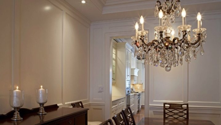 Дори красивите лампи могат да действат като декоративен елемент. За декорация и създаване на уютна атмосфера в стаята можете да използвате полилеи от ковано желязо или кристал.. Това е скъп полилей с кристални висулки и имитация на свещи, който е може би основният символ интериор в класически стил.