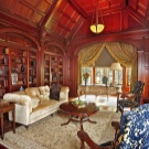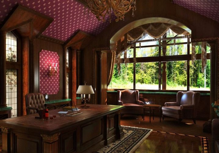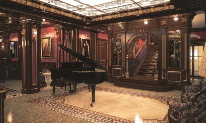 Първият пример е луксозна вила в тъмни цветове. Тъмните цветове не пречат тук и не развалят нищо просто защото има много място, което означава, че няма нужда визуално да увеличавате стаята с помощта на светли цветове и огледални повърхности. За декориране на интериора се използват дървени ламперии и червен плат с топли златисти шарки. Не само мебелите бяха съчетани с тона, но и шикозно стълбище, водещо към втория етаж. В такава къща всеки може да се почувства като представител на света на аристокрацията..