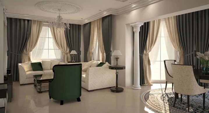 Третият интериор в класически стил е най-лекият. Таванът е украсен с бяла мазилка, а подът е с плочки, за да отразява отблясъците на слънцето, което прави стаята да изглежда по -голяма. Светлите завеси също са съчетани с тона, които се редуват с по -тъмни материи. На пръв поглед стаята е доста проста, но при надлежно обмисляне окото се вкопчва в детайли като красив полилей, масивна колона и чист килим. Всички те хармонично допълват интериора и му придават уникалност..