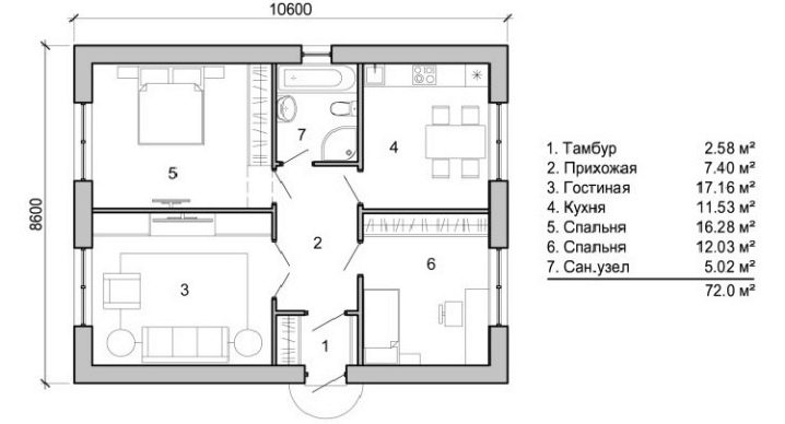 Обикновена частна къща с площ от 72 кв. м с три пълни дневни – хол, големи и малки спални. Входната врата е разположена с леко отместване от центъра на фасадата, така че антрето разделя сградата на две неравни части. От лявата страна площта е по -голяма, в нея се помещават залата и спалнята на родителя. От по -малката дясна страна е кухнята и детската стая. Точно по коридора има комбинирана баня.. Благодарение на това оформление достъпът до всички стаи се осигурява отделно..