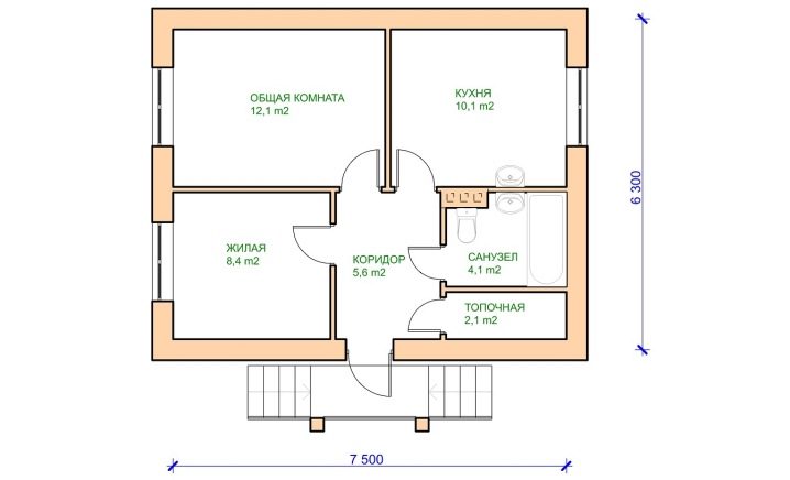 Малка вила с размери 7,5 м на 6,3 м съдържа само две дневни – хол и спалня. Входът на къщата е от двустранната веранда, разположена в центъра на фасадата. Просторен коридор обединява жилищни и технически помещения: отляво – спалня, отдясно – пещ и баня. Входното антре се опира на още две стаи – антре (отляво) и кухня (отдясно).