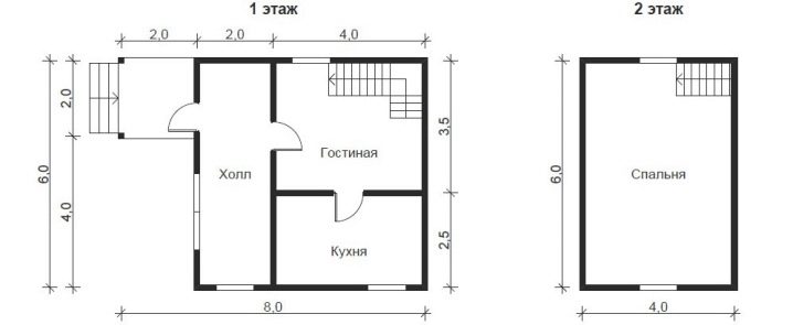 Най -лаконичното оформление на къща с таван с размери 6×6 кв. м. Входът на вилата е изместен наляво, води до голяма зала (6х2 кв. м.). От залата можете да влезете в хола, от който да имате достъп до кухнята и спалнята (стълби към таванския етаж).