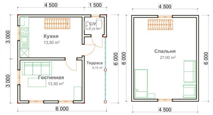 Друга малка къща от икономична класа с таванско помещение (6х4,5 кв. М.), Вътре в което също няма баня. Намира се в затворена част на терасата, на самия вход на къщата.. От улицата можете да влезете директно в кухнята (15,5 кв. М), тъй като няма антре, а от кухнята – в коридора (13,5 кв. М) и да се качите на таванския етаж към спалнята (27 кв. М). Терасата се намира под същия покрив като къщата. Проектът не предвижда място за вестибюл, антре и коридори, цялото свободно пространство е предвидено за всекидневни и кухня.