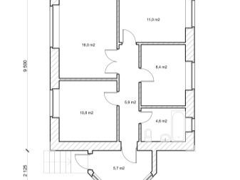 1-етажна вила с размери 9,5х8 кв. m е надарен с красива входна група, разположена в края на къщата – покрито разширение с еркери. Дълъг коридор минава в една от спалните (11 кв. М), вляво има хол (16 кв. М) и втора спалня (10,8 кв. М), а вдясно е комбинирана баня ( 4,6 кв. М) и кухня (6,4 кв. М).