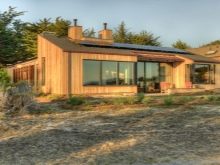 Но не е нужно да пестите пари, ако изберете покрив със сложна форма, а не обичайното оформление на фронтон.. Фасадата на ранчото е тапицирана изключително с дърво. Имитацията на лента ще изглежда добре.