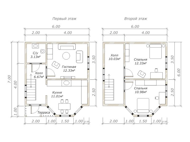 Като се имат предвид всички горепосочени характеристики, повечето проекти на двуетажни къщи с размери 6×7 приличат на сграда с таванско помещение като 2-ри етаж, която често се използва по свое усмотрение. Като правило има спални и шезлонги..