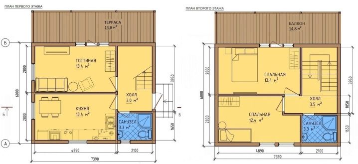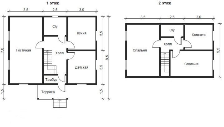 Като се имат предвид всички горепосочени характеристики, повечето проекти на двуетажни къщи с размери 6×7 приличат на сграда с таванско помещение като 2-ри етаж, която често се използва по свое усмотрение. Като правило има спални и шезлонги..