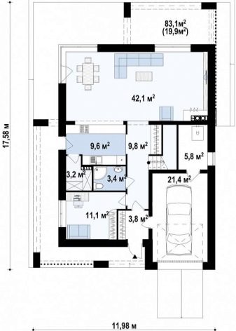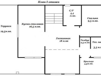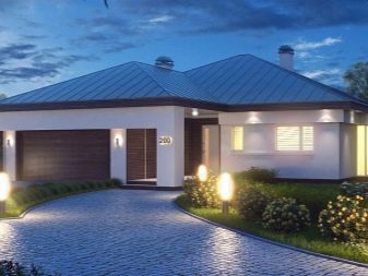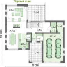 Първо, нека разгледаме пример за едноетажен проект.. Къщата заема място с размер 18,21х14,63 м върху парцел. Три спални – 16.3, 16.4 и 16.5 м2. Тераса – 13,8 м2, кухня с трапезария функции – 35,4 м2. Две бани – 2 и 5.4 м2. Работилница – 6,5 м2, гараж – 32,8 м2 за няколко автомобила. Два преддверия – 3,7 и 4,8 м2. Втора кухня и килер – съответно 8,9 и 3,3 м2.