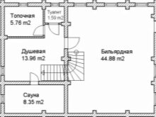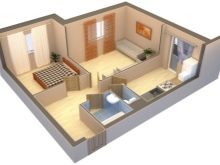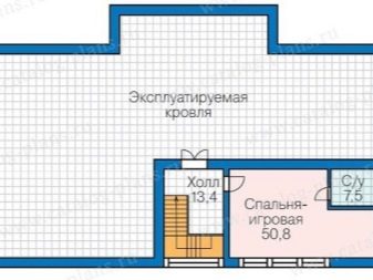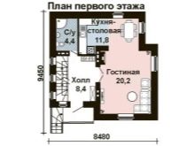 На приземния етаж ще бъде оборудвана смесена кухня и трапезария. Площта му е 11,8 кв. м, което е не по -малко, отколкото в типичните апартаменти. Има и баня в 4 “квадрата” – това е напълно достатъчно за обикновените хигиенни процедури. На тавана се подрежда по -голяма баня. Те също така правят няколко спални и коридор, без които ще бъде трудно да се използват стълбите..