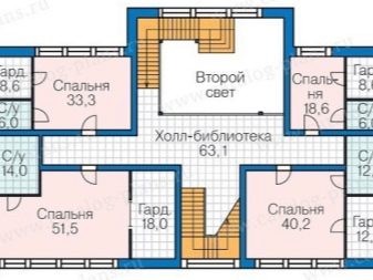 Вторият етаж е оборудван с втора светлина. Дизайнерите са предвидили наличието на гардероб и четири спални тук, които ще подхождат дори на голямо и проницателно семейство. Освен това има 3 гардероба и 4 бани. Залата е комбинирана с библиотеката.