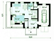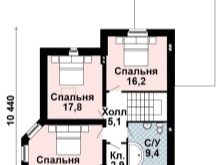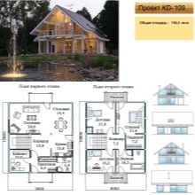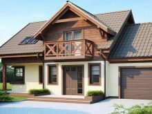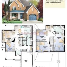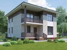 - Компактна и просторна къща с таванско помещение, построена от SIP панели. Квадратна в план, тя се допълва от втора светлина и е облицована с декоративни тухли. Високите прозорци придават на фасадата специален чар, а в задния двор е предвиден навес. Първият етаж с отворен план ви позволява да комбинирате кухнята, трапезарията и хола, 2 спални са на тавана, 1 е долу – всички те са изолирани, доста просторни.