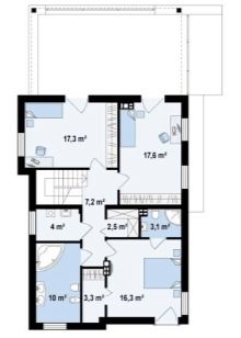 Високотехнологична двуетажна къща с 4 спални и 3 бани. Камината добавя особен комфорт към атмосферата, а прилежащият гараж решава проблема със съхранението на личен автомобил. Обектът може да бъде изграден от бетон, керамични блокове, тухли. Плоският покрив подчертава съвременния облик на сградата.