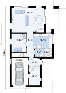 Изборът на проект в този случай може да бъде типичен. Напълно възможно е да намерите много предимства в едноетажни решения за планиране. Сред тях – липсата на трудности с доставката на комуникации, лекота на поддръжка на сградата. Строителните работи също могат да бъдат извършени за кратко време, а изпълнението им ще изисква минимални разходи. Сложна и скъпа основа също не е необходима, ще бъде възможно да се мине с обикновена плоча, а в някои случаи дори купчини. Едноетажните сгради нямат ограничения за строителство върху сложни и вдлъбнати почви.