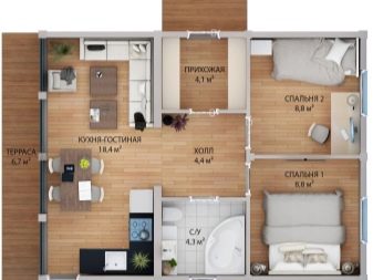 И затова във всеки план ще има тънкости и нюанси, които са напълно незабележими за непосветените. При една от тези опции общата площ е близо 70 кв. м, но жилищната площ е само около 43 квадратни метра. Има функционални опции като таванско помещение и втора светлина.