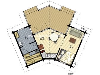 Входът на сградата от светли тухли се намира в страничната стена. Площта на вестибюла е почти 2,5 м2. Частта от сауната е оборудвана както трябва: има съблекалня, собствен вътрешен вестибюл и пералня, парна баня.. Жилищни и помощни помещения са представени: