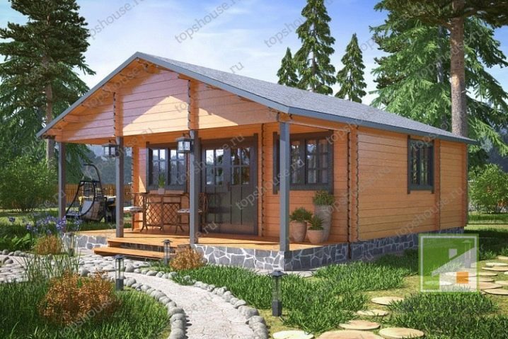 От съображения за икономичност и максимална практичност, едноетажни къщи често се избират за лятни вили.. И такива опции също са в изобилие. Една от тях разполага с красиво обзаведена тераса, покрита с повдигнат покрив. Общата площ достига 45 кв. м. Въпреки че дизайнерите умишлено са изоставили подреждането на тавана, те са изработили всички комуникации – отопление, водоснабдяване, електричество и дори канализационна система с вентилация.