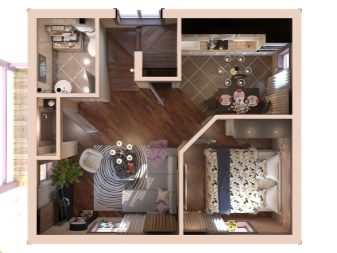 Можете да разгледате по -отблизо друг вариант. Кухнята, холът и холът са практически обединени тук, няма твърди граници между тях. Има отделен ъглов санитарен възел. Горе, на тавана, те поставиха няколко спални с различни размери..