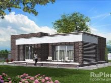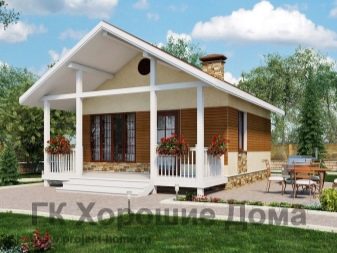 От съображения за икономичност и максимална практичност, едноетажни къщи често се избират за лятни вили.. И такива опции също са в изобилие. Една от тях разполага с красиво обзаведена тераса, покрита с повдигнат покрив. Общата площ достига 45 кв. м. Въпреки че дизайнерите умишлено са изоставили подреждането на тавана, те са изработили всички комуникации – отопление, водоснабдяване, електричество и дори канализационна система с вентилация.