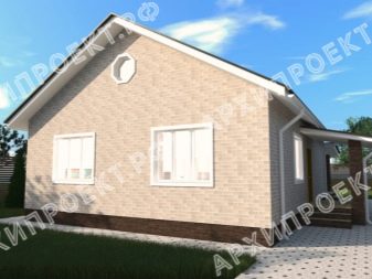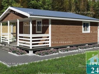 Можете да разгледате по -отблизо друга, малко по -голяма структура, удължена по дължина.. Тук изтичането на двускатния покрив вече се използва обичайно за контурите на основната част на къщата. Фасадата на къщата е завършена с имитация на дървен материал. Имаше място не само за спалнята, но дори и за детската стая. Размерът на верандата достига 11 м2.