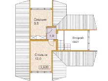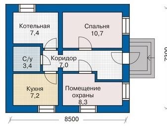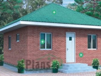 Входът на сградата от светли тухли се намира в страничната стена. Площта на вестибюла е почти 2,5 м2. Частта от сауната е оборудвана както трябва: има съблекалня, собствен вътрешен вестибюл и пералня, парна баня.. Жилищни и помощни помещения са представени: