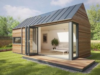 Често сградите с панорамно остъкляване се появяват като най -добрите. Трябва веднага да се има предвид, че присъствието му веднага “повдига летвата” на малка площ. Може вече да включва жилища с висок комфорт, а не само до 50 кв. m както обикновено. И така, една от едноетажните къщи с големи прозорци започва от 6-метрова тераса. Те се присъединяват към нея хармонично: