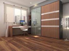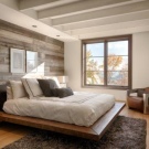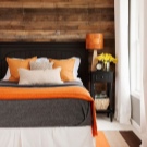 Избраният стил на панелния апартамент е минимализъм. Дървените панели са в хармония с лекия интериор, визуално разширявайки пространството. Цветовата схема е издържана, а акцентите са зададени от тъмни елементи – възглавници и спално бельо..
