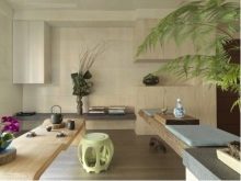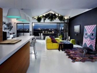 Интериорът е направен в контраст на цветовете, в съответствие с ясни строги линии. Този стил не е завършен без жив зелен декор за омекотяване на твърдите контури на мебелите. Листата придават на интериора атмосфера на спокойствие и комфорт. Големите отвори за прозорци изпълват стаята със светлина, а пространството с въздух.
