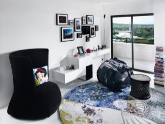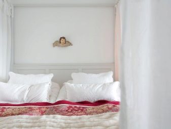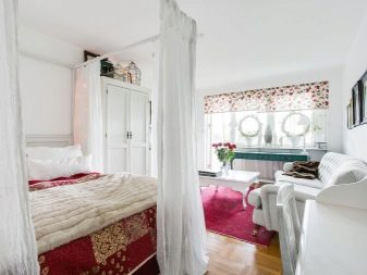 Собствениците на апартаментите са извършили функционално зониране на пространството. И така, леглото на детето е оградено със завеса. Романтичният стил на интериора е създаден поради преобладаването на светла цветова палитра и мебели с необичайна форма. Използването на ярки цветни акценти допълва визията. Този цвят символизира увереност и непоколебимост. Таванът и стените са завършени в един цвят, за да визуално разтягат пространството.