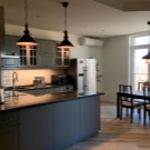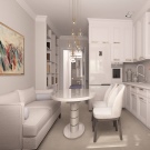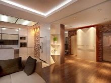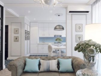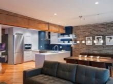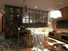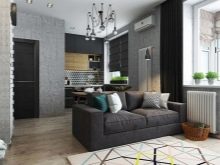 За да получите “студио” от такива апартаменти, кухнята е свързана със съседната стая, а функционалните зони са разделени с мебели и осветление..