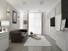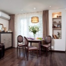 Малки модулни мебели са монтирани в двустайната “брежневка”. Цялата среда е многофункционална, което ви позволява да спестите място в малка стая.