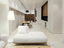 Един от отличителните белези на съвременния дизайн е максималното осветяване на апартамента.. Експертите съветват да инсталирате огромни прозорци. Тези монументални отвори създават усещане за лекота. Използването на монохроматично покритие в светли цветове: бежово, бяло и праскова ще помогне за разширяване на пространството. Невъзможно е да си представим модерен интериор без използването на ярко акцентно място..