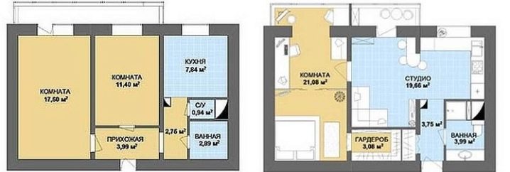 Важно е да се вземе предвид, че такива апартаменти се намират в панелни къщи, което не само не позволява демонтаж на стените, но и преместване на врати. Единственият възможен вариант за промяна на дизайна е да се разширят размерите на стаите поради пространството на коридорите.