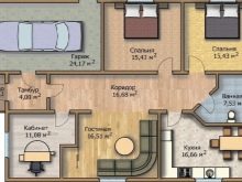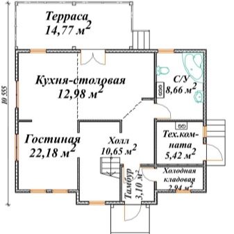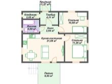 Помислете за малък проект на едноетажна къща. Основната площ на къщата е 7 на 9 м. Сградата има малка веранда (размерите са произволни, както и факта, че може изобщо да не е). Тамбурът не надвишава 4 м2, наблизо има врата, която ще води към склада (1,5-2 м2). От предверието ще има изход към малка зала до 3 м2. Има две спални, едната 10 м2, а другата приблизително 11 м2. От залата има врата към банята, не повече от 5 м2. Кухнята често е в такива къщи, свързани с хола и има обща площ от 20-23 м2, останалата площ обикновено се използва за вътрешен двор, вътрешен двор.