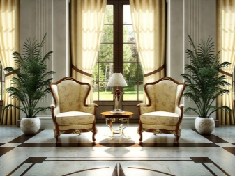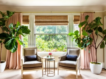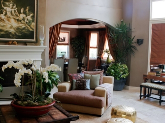 - Ако трябва да украсите просторна всекидневна с домашни растения, можете да закупите доста големи и високи видове като фикус, хибискус, както и палмово или мандариново дърво. Такива високи растения се съчетават перфектно с други домашни цветя..