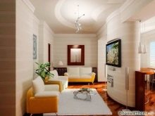 - Можете да украсите хола “Хрушчов” в приглушени цветове, създавайки усещане за интимност и мир. В апартамента са премахнати всички ненужни прегради. Пространството се разширява и чрез използването на огледален таван.
